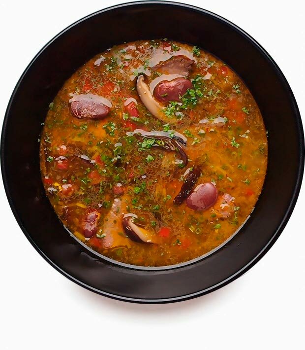 500 г говядины с костями или копченой свинины, 30 г сушеных боровиков, ? литра квашеной капусты, различные коренья, 10 горошин перца, 1 лавровый лист, 1 ст. ложка муки, 1 ст. ложка топленого сала, 1 ст. ложка томатного пюре, 3 ? литра воды, соль, 1 луковица.Из