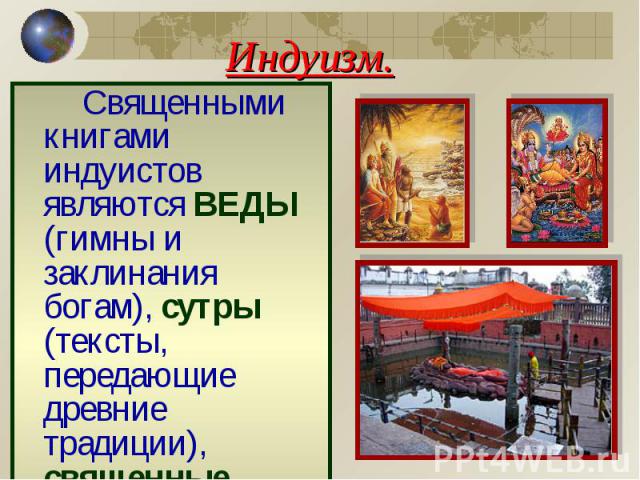 В индуизме есть не одна священная книга, а несколько писаний. Священные писания Вед направляют индуистов в их повседневной жизни. Они также помогают сохранить религиозные аспекты семьи и общества. Индусы разработали свою систему поклонения и верований на основе священных писаний.