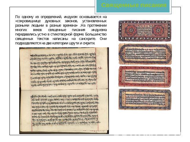 Священные Писания индусов в основном состоят из следующих произведений, написанных на санскрите: