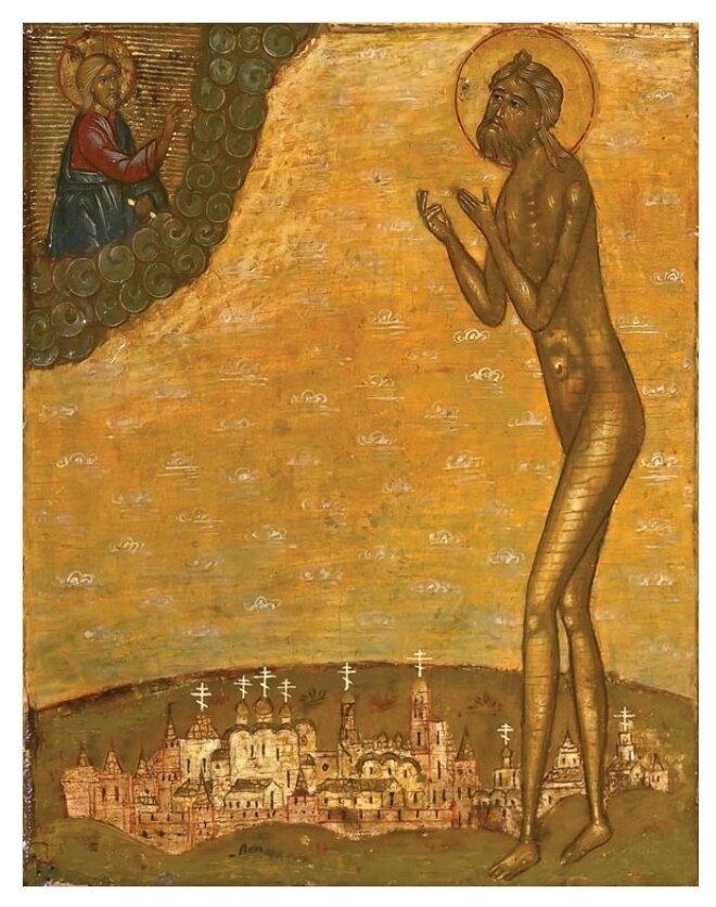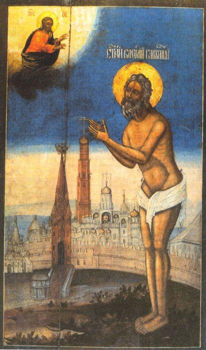 В 16 лет святой пришел в Москву и начал тернистый подвиг юродства. В палящий летний зной и трескучий лютый мороз ходил он нагой и босой по улицам Москвы. Странны были его поступки: то опрокинет лоток с калачами, то прольет кувшин с квасом.
