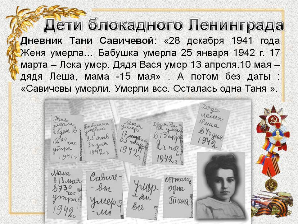 «Женя умерла 28 дек в 12.00 час утра 1941 г.», — эта запись на букву «Ж» стала первой в записной книжке Тани Савичевой. Ее она сделала после смерти старшей сестры. И продолжала записывать даты смерти остальных родственников, используя соответствующие буквы: «Б» — бабушка, «Д» — дяди, «М» — мама. Дневник заканчивается записями «Савичевы умерли», «Умерли все» и «Осталась одна Таня», сделанными на страницах с буквами «С», «У» и «О».