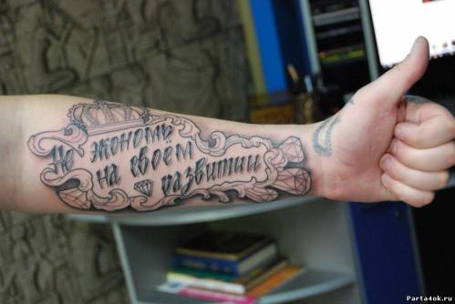 Иногда на плече набивают татуировки святых, на пример Иисуса; - Предплечье – в основном на руке накалывают райские врата, лики святых, Иисуса Христа. Рисунок в этом месте обозначает силу духа, тягу к Богу;