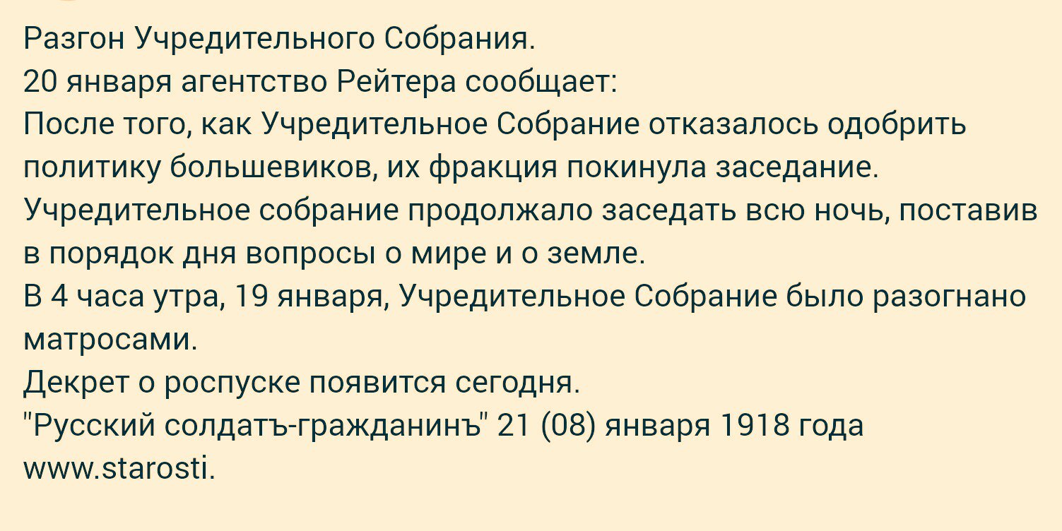 Через сутки после разгона Учредительного собрания, в ночь на 7 (20) января, ВЦИК принял написанный Владимиром Лениным декрет о его роспуске, в котором говорилось: