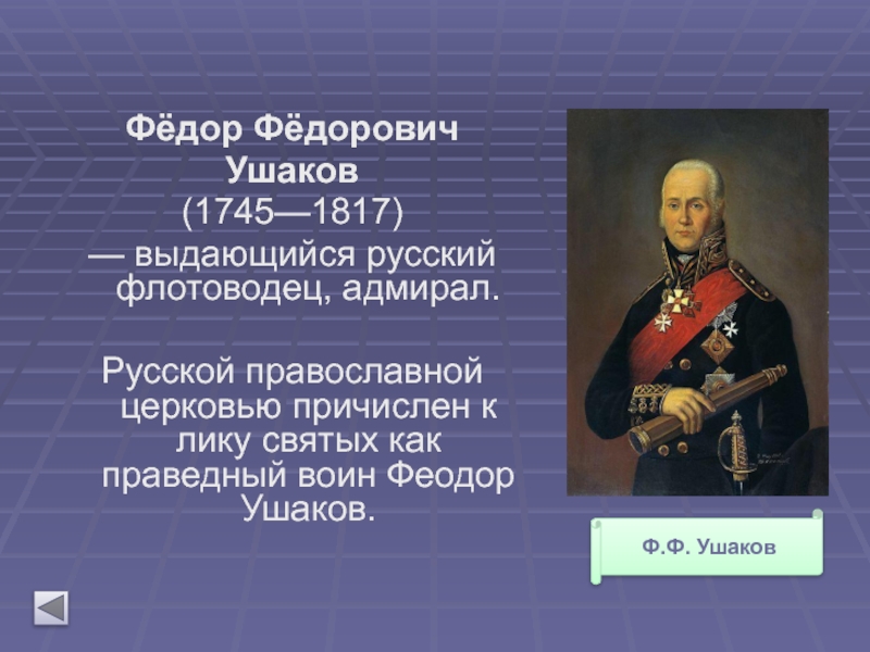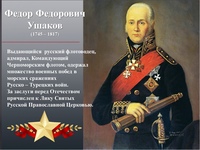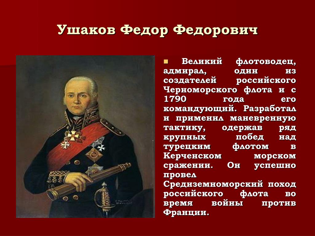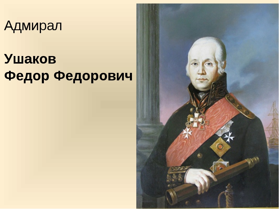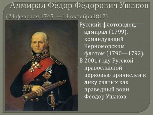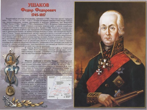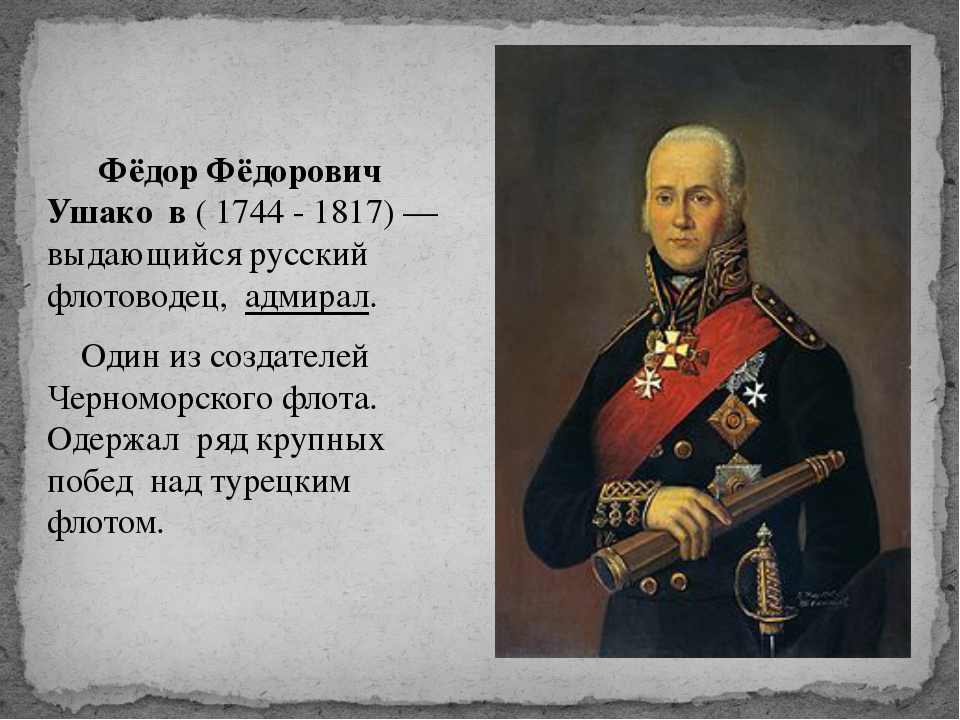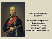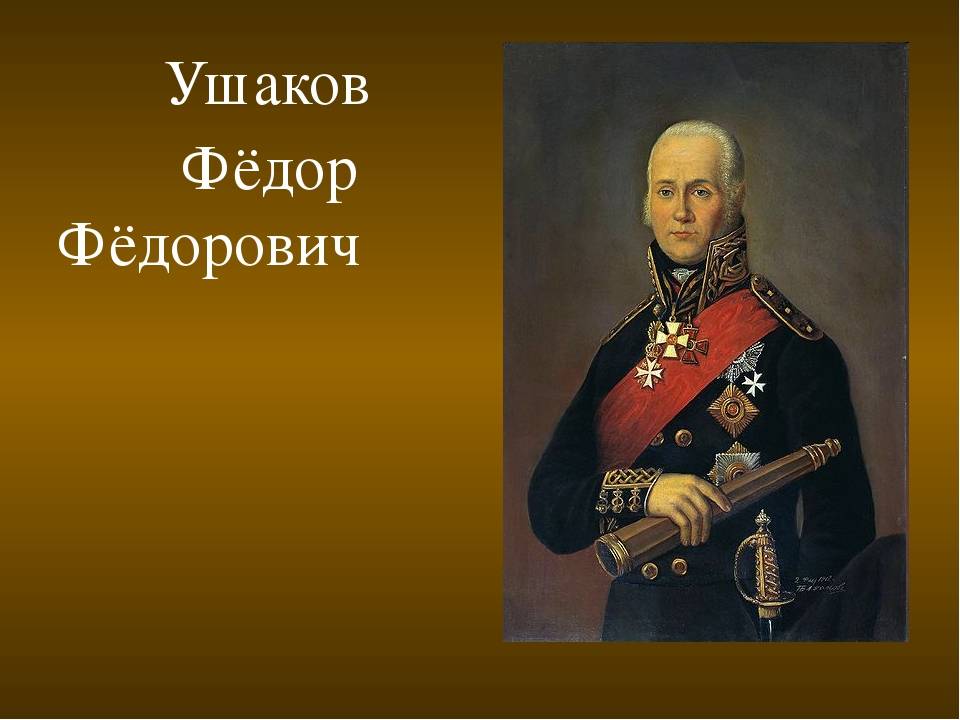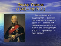 Ушаков Фёдор Фёдорович (1745—1817), российский флотоводец, адмирал (1799 г.), один из создателей Черноморского флота.