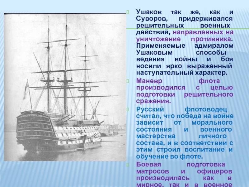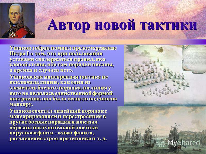 В историю мореходного дела всего мира Ушаков вошел не только как непревзойденный никем по результативности адмирал, но и как автор совершенно новой тактики боя парусного флота. Он огромное внимание уделял подготовке экипажей каждого корабля своей эскадры, чем сильно отличался от командующих тех лет. Адмирала любили подчиненные: он был жестким и требовательным, но не жестоким.