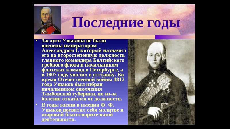 Впрочем, Ушаков и сам был рад этому: многие годы плаваний не способствовали укреплению здоровья, а потому уже в 1807 году он уходит в отставку. Во время нападения французов в 1812 году он возглавлял Тамбовское ополчение, но из-за плохого физического самочувствия лично в боях уже не участвовал. Скончался прославленный флотоводец в 1817 году, был торжественно похоронен в Санаскарском монастыре.