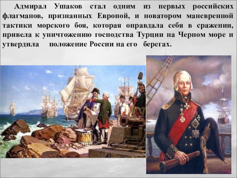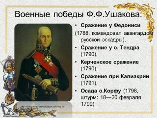 Руководя в чине адмирала Средиземноморским походом (1798—1800 гг.), Ушаков десантом с моря под прикрытием корабельной артиллерии взял занятую французами неприступную крепость на острове Корфу и, оставаясь убеждённым монархистом, способствовал основанию демократического греческого государства.