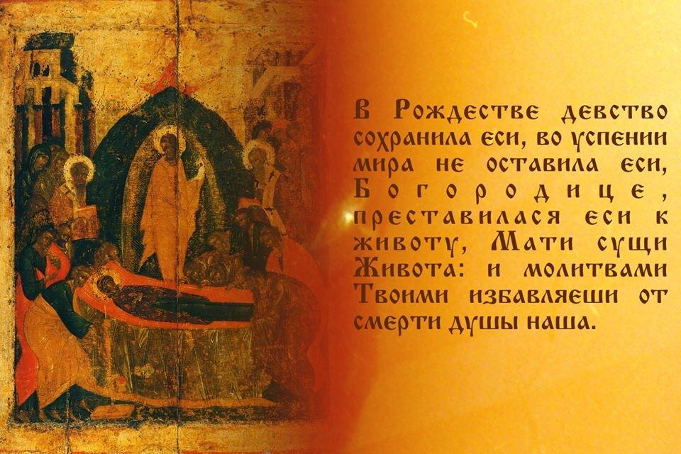 «В рождестве девство сохранила еси, во успении мира не оставила еси, Богородице, преставилася еси к животу, Мати сущи Живота, и молитвами Твоими избавляеши от смерти души наша».