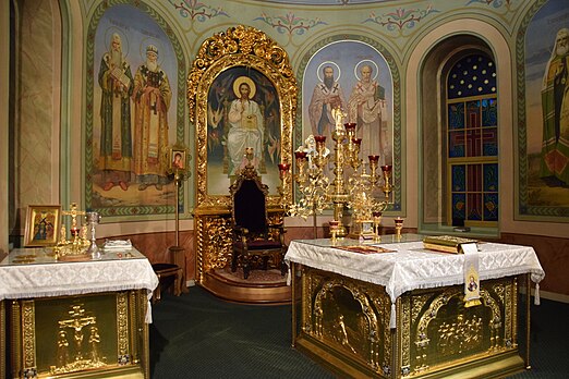 Кафедра — это кресло, на котором сидит правящий архиерей, символизируя Христа Вседержителя, а духовенство в свою очередь изображает апостолов или тех старцев-священников, из видения евангелиста Иоанна Богослова во время архиерейских богослужений. В современных храмах чтят древние традиции и в восточной стене алтаря с внешней стороны храма оставляют полукружие – абсиду.
