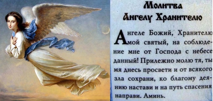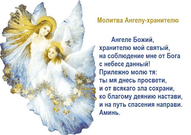 «Святой Христов Ангел, к тебе припадая, молю тебя, Хранитель мой светлый, данный мне от Святого Крещения для сохранения души моей и тела моего грешного. Я своими неправедными делами гневаю твою пречистую светлость и отталкиваю тебя ложью, клеветой, завистью, осуждением, непокорностью,