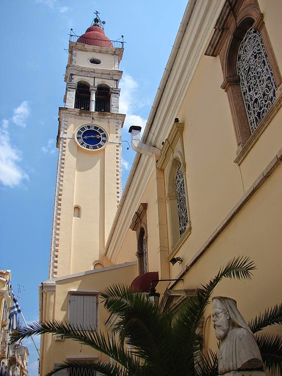 В одноименном храме на острове Корфу, в городе Керкира, находятся мощи Святого Спиридона. Храм был построен в 1589 году, высокая колокольня, как дополнение к храму, была построена в 1620 году.
