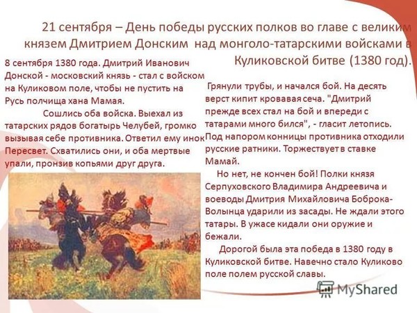 8 сентября 1380 года возле впадения в Дон речки Непрядвы произошло сражение, получившее название Куликовской битвы.