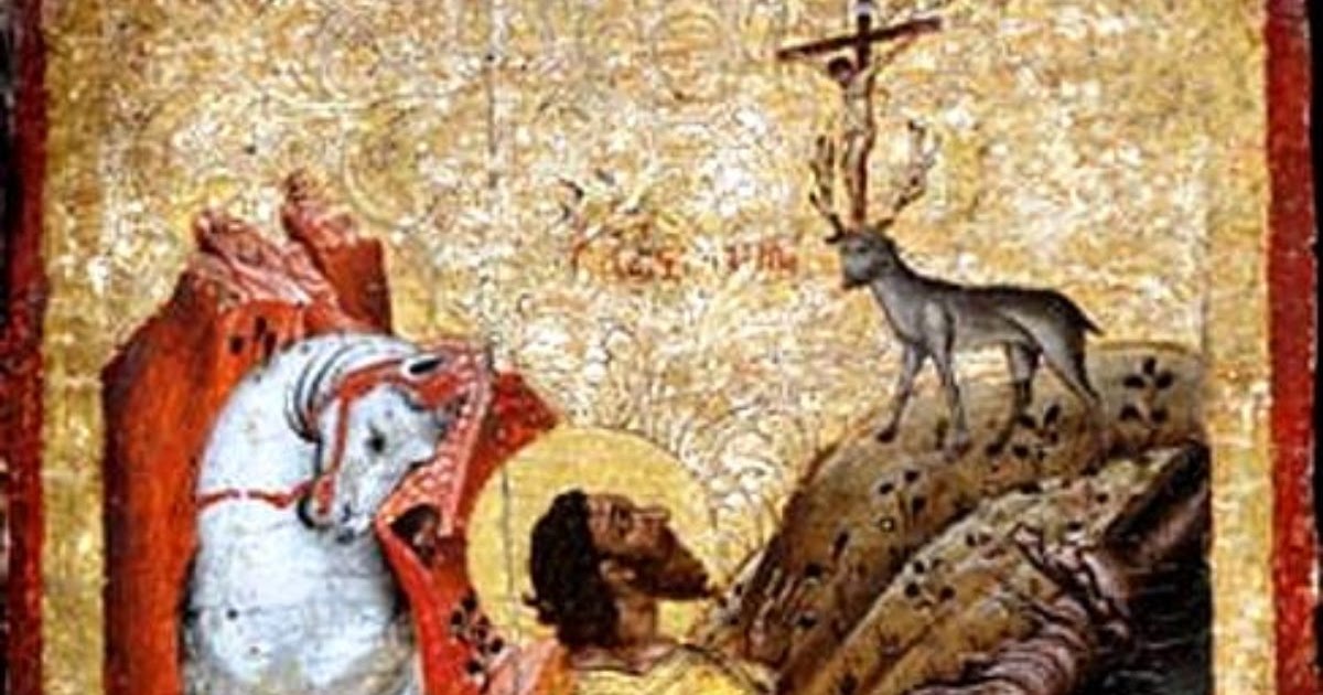 Однажды во время охоты в лесу он увидел оленя, который то и дело останавливался, чтобы посмотреть ему прямо в глаза. Пласидас преследовал его верхом, но не смог догнать. Олень перепрыгнул через пропасть и встал с другой стороны, лицом к нему. Плацид вдруг увидел сияющий Крест между его рогов.