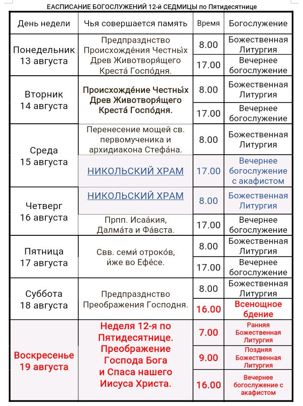 Расписание служб в Храме святых апостолов Петра и Павла: