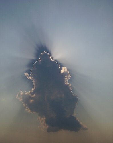 Сначала ничего необычного не было, но потом стало происходить что-то необыкновенное: солнце, находясь на линии горизонта за Лисьей горой испускало вверх столб света, и вдобавок свет отражался от висящего над ним параллельно земли облака.